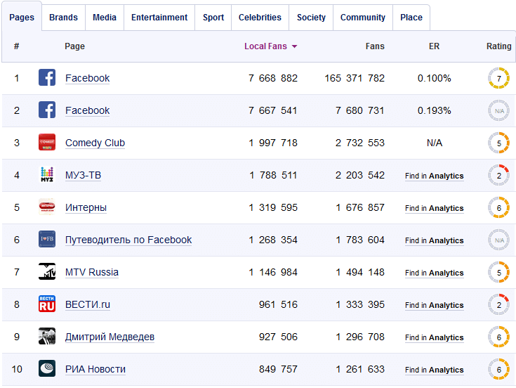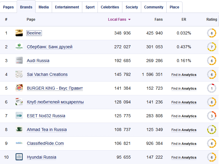 Аналитическая компания Socialbakers опубликовала на своем сайте рейтинг активности российских брендов в соцсети Facebook. Брендами с наибольшим количеством подписчиков стали: