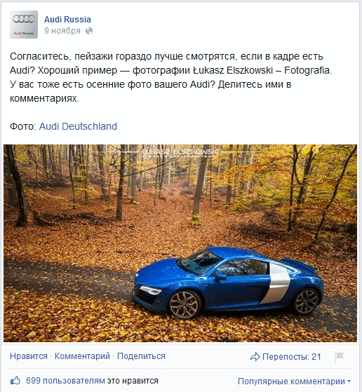 Audi Russia тоже знают о преимуществах общения со своими подписчиками, и обращаются к ним с просьбами и вопросами:
